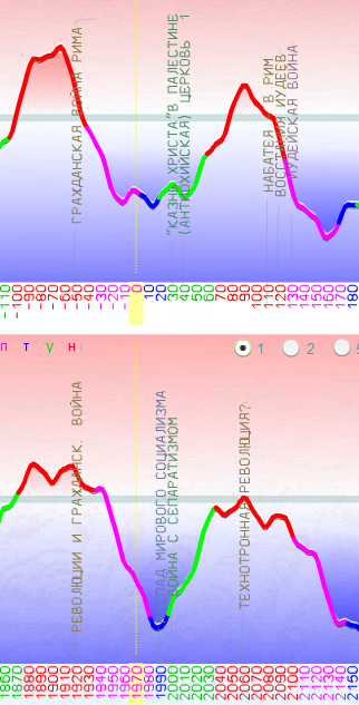 На скриншоте компьютер вычислил количество приходящей солнечной радиации в северное полушарие Земли, в христианской древности и в наше время. Обратите внимание на нижние (синие) участки графика